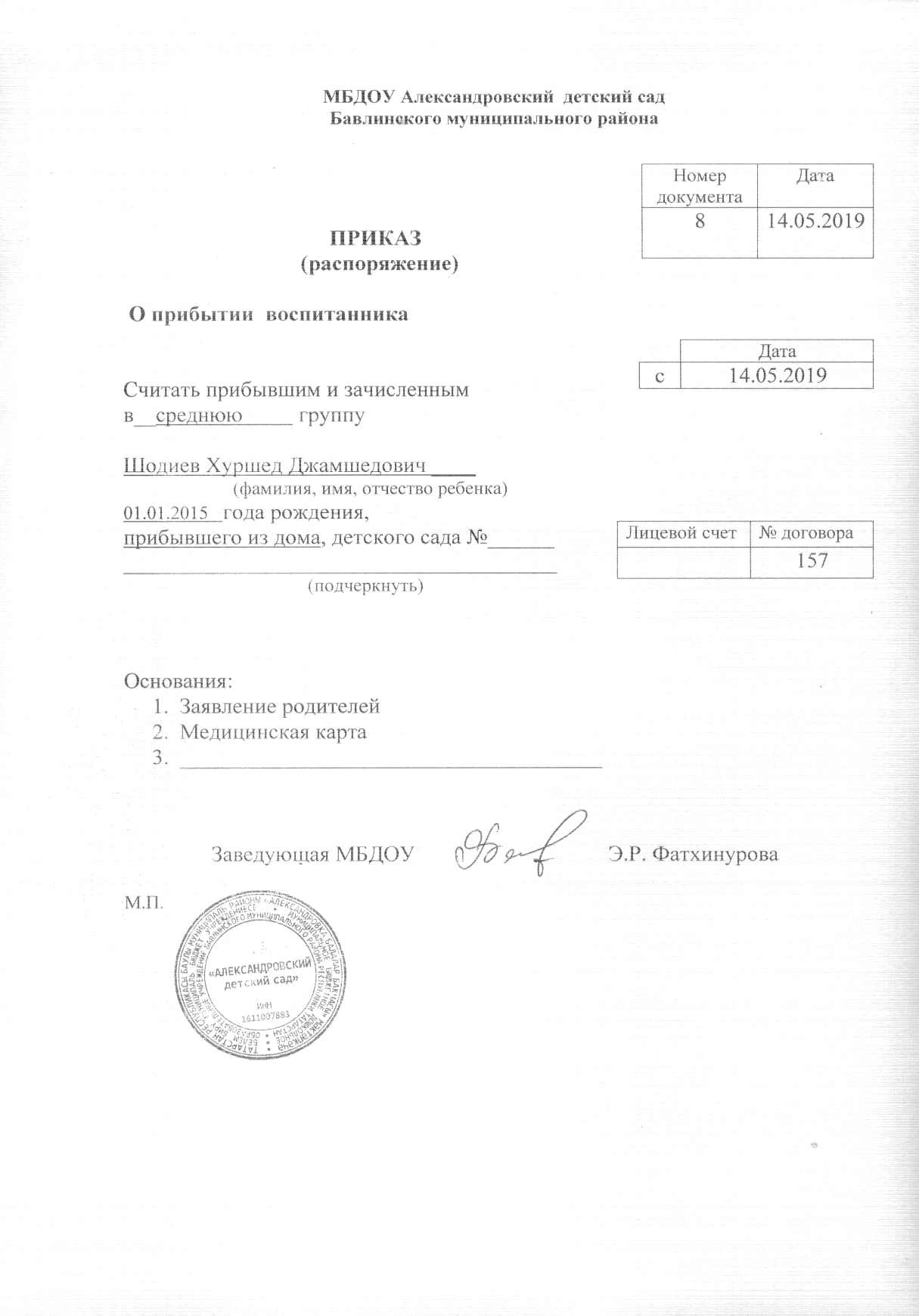 Приказ о прибытии в среднюю разновозрастную группу 1 воспитанника № 8 от 14.05.2019г.bmp