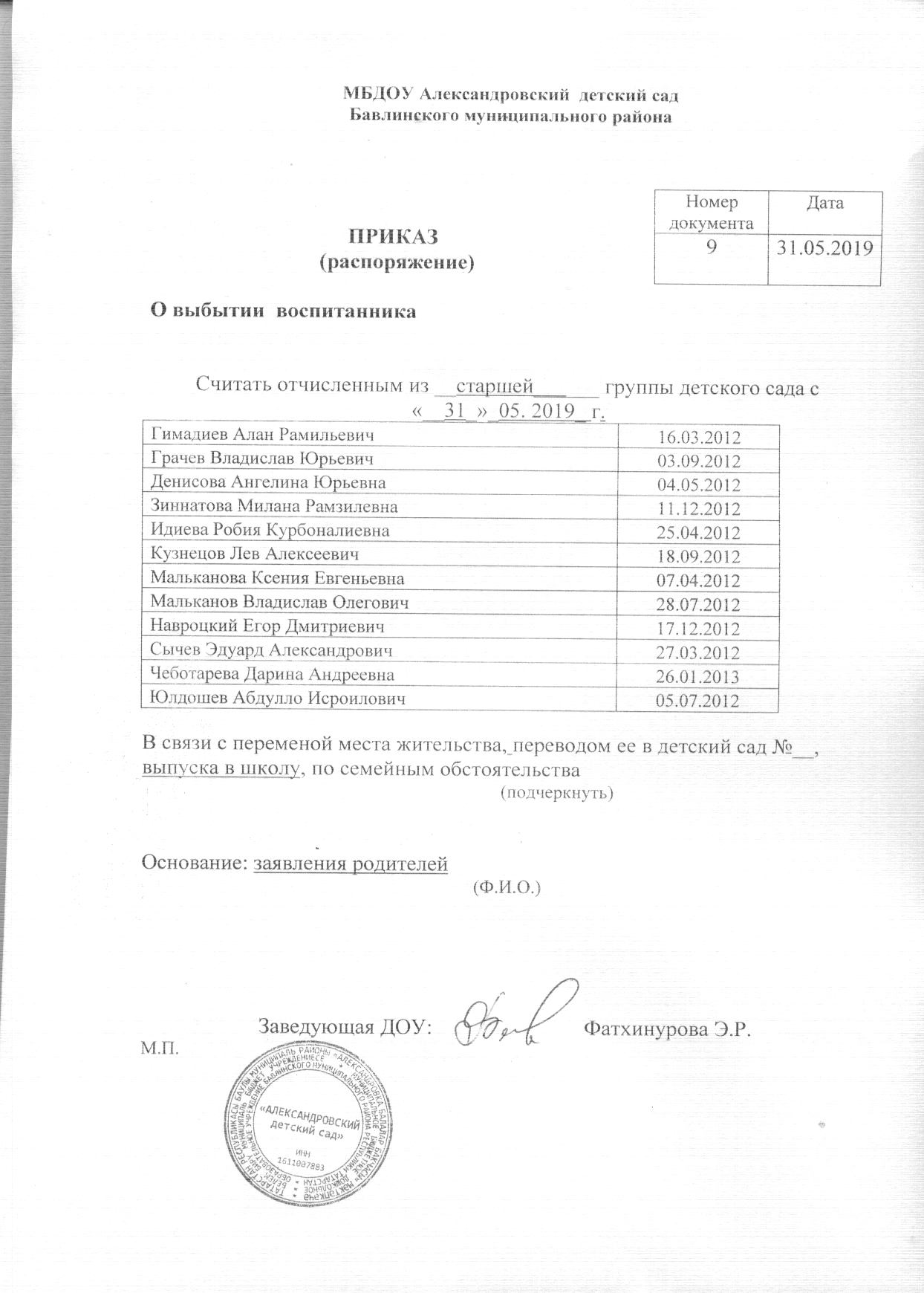 Приказ о выбытии из старшей разновозрастной группы 12 воспитанника № 9 от 31.05.2019г..bmp