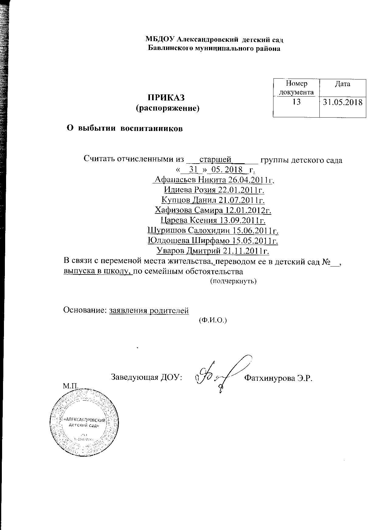 приказ о выбытии из старшей разновозрастной группы 8 воспитанников № 13 от 31.05.2018г.bmp