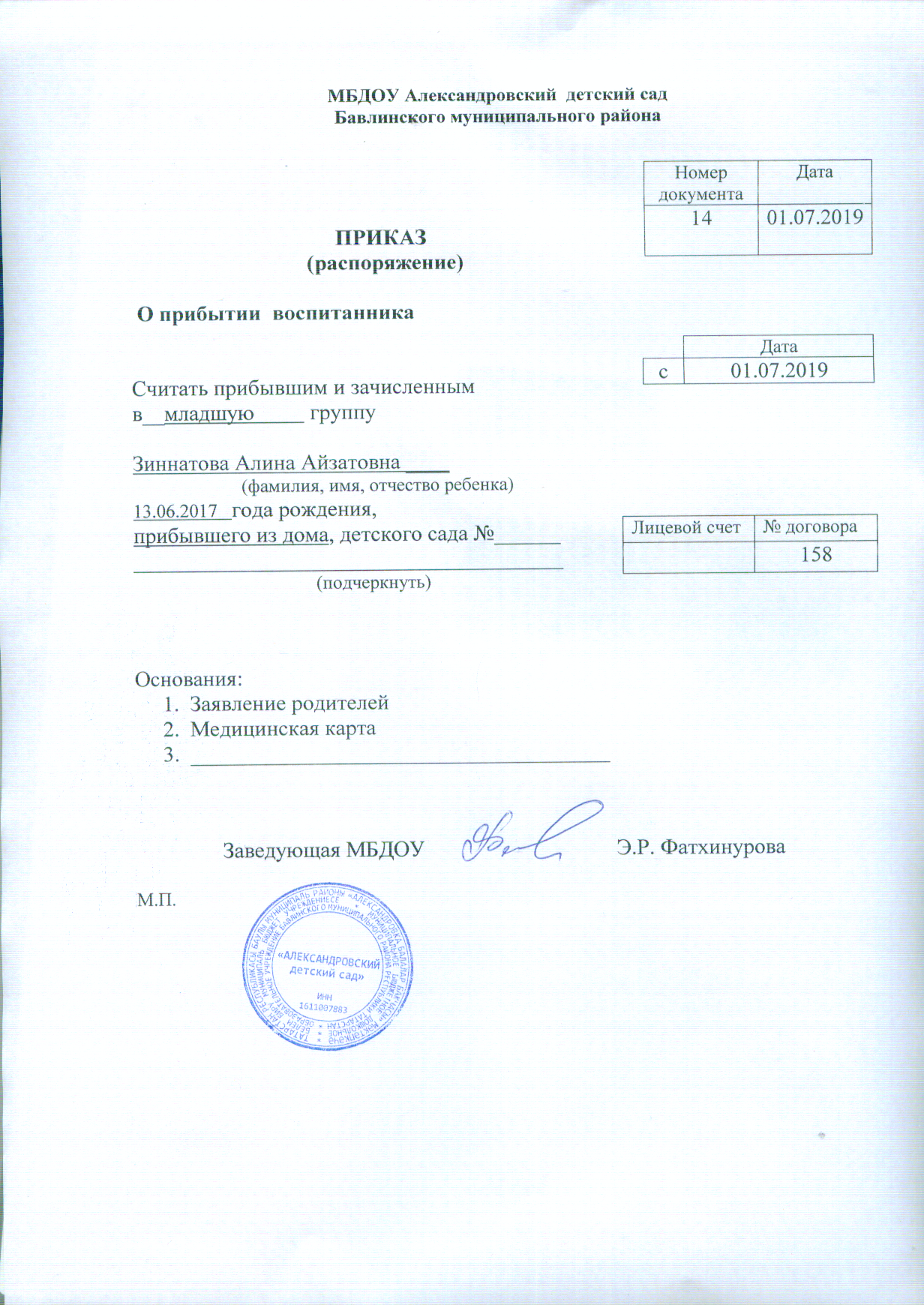 Приказ о прибытии в младшую разновозрастную группу 1 воспитанника № 14 от 01.07.2019г.bmp