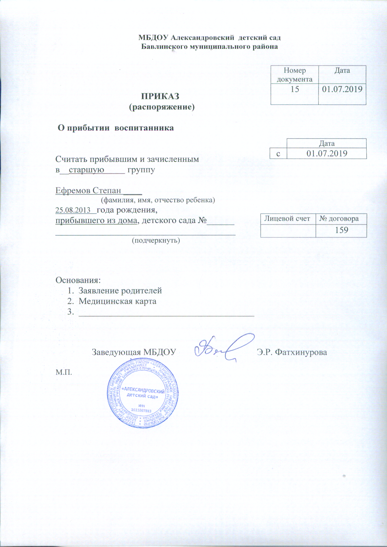 Приказ о прибытии в старшую разновозрастную группу 1воспитанника №15 от 01.07.2019г.bmp
