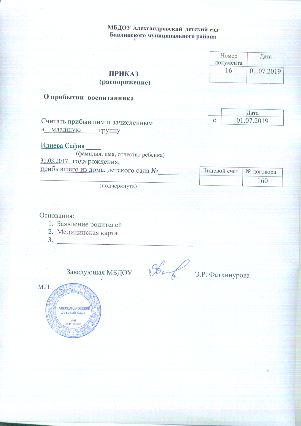 Приказ о прибытии в младшую разновозрастную группу 1воспитанника № 16 от 01.07.2019г.bmp