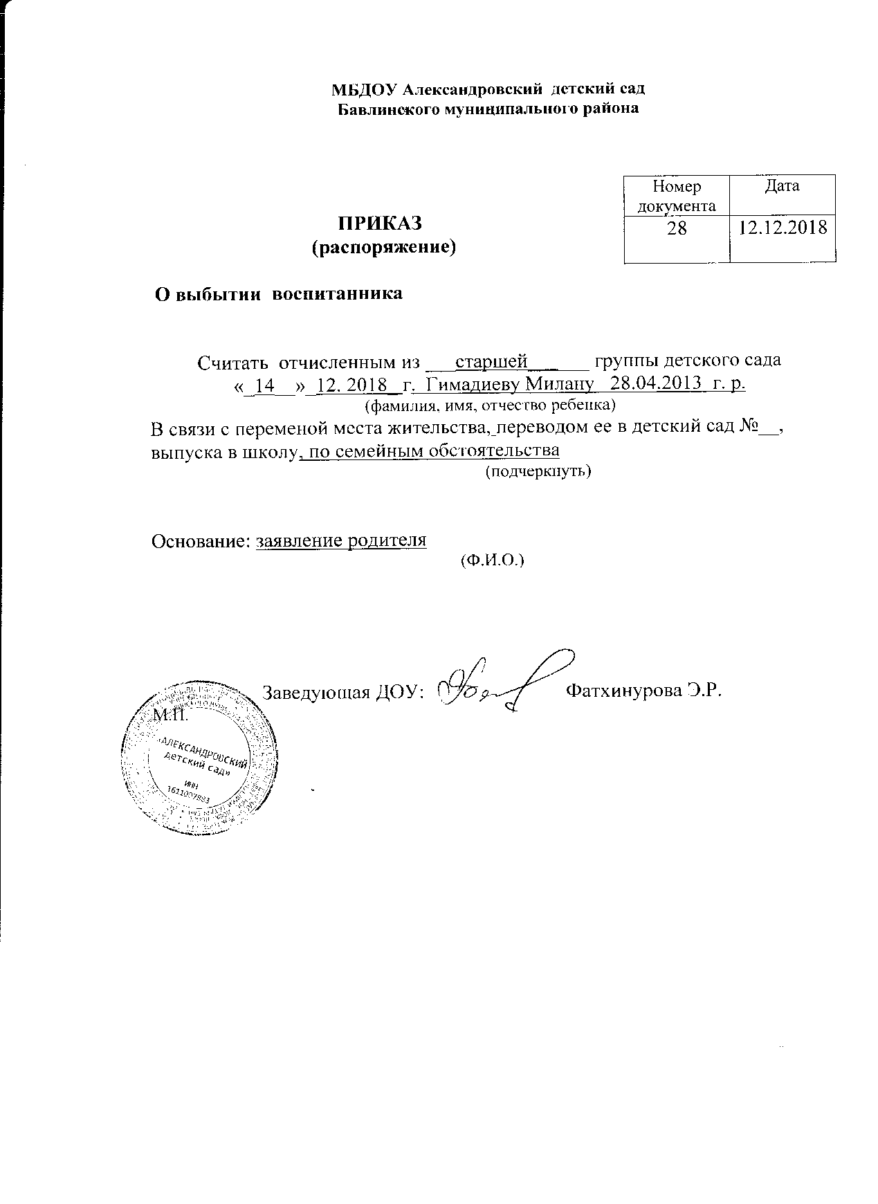 Приказ о выбытии из старшей разновозрастной группы 1 воспитанника № 28 от 12.12.2018г.bmp