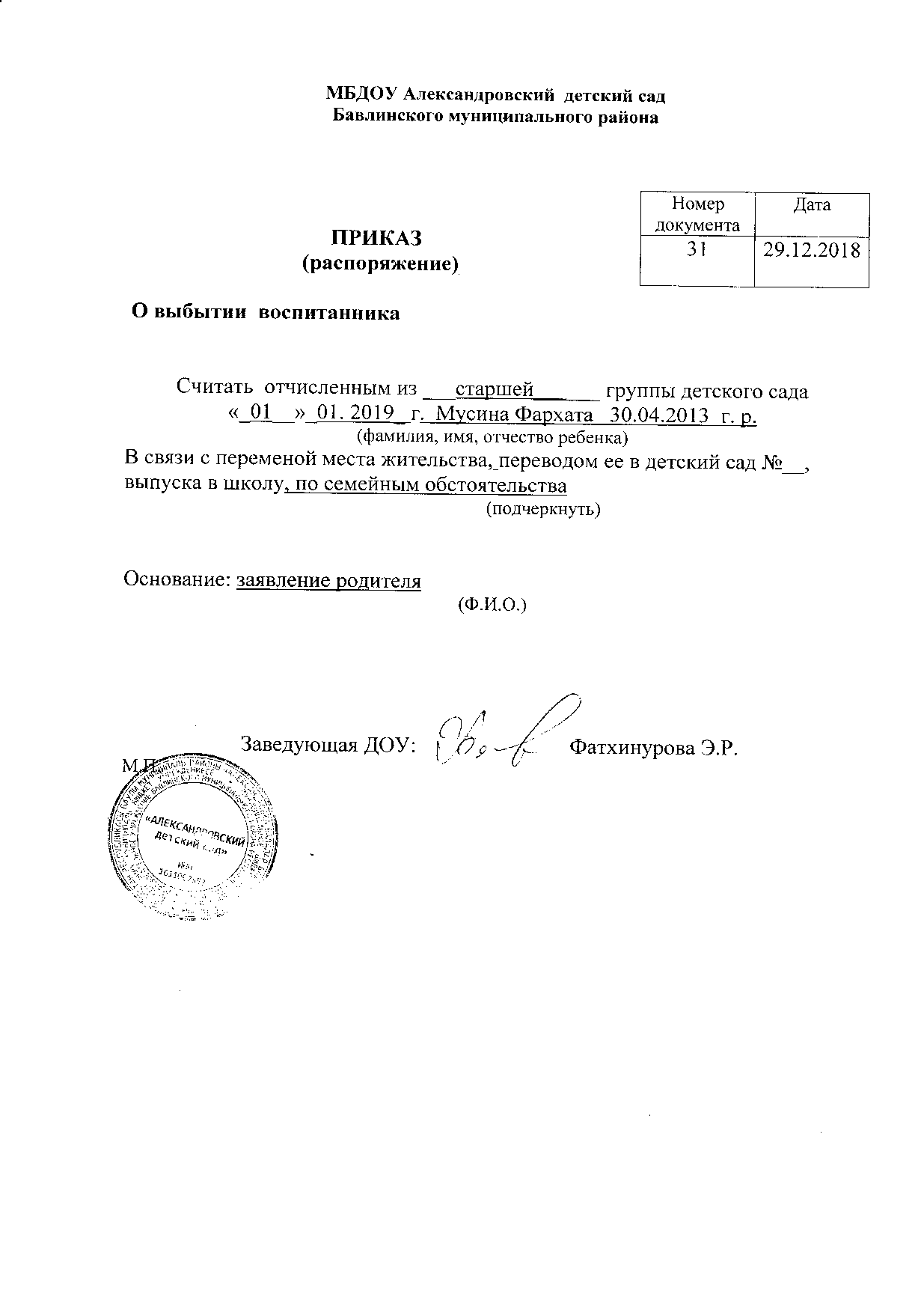Приказ о выбытии из старшей разновозрастной группы 1 воспитанника № 31 от 29.12.2018г.bmp