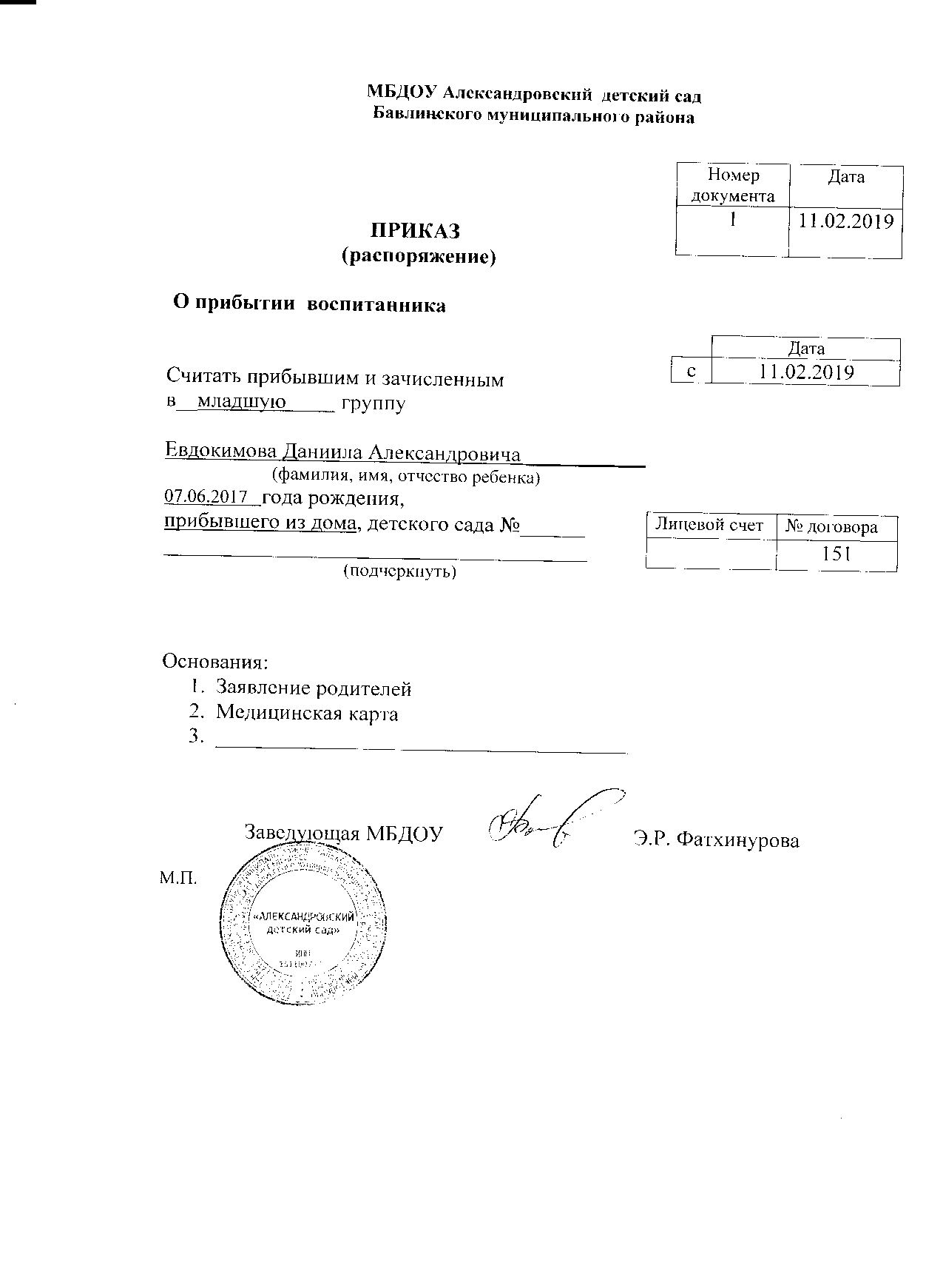 Приказ о прибытии в младшую разновозрастную группу 1 воспитанника № 1 от 11.02.2019г.bmp