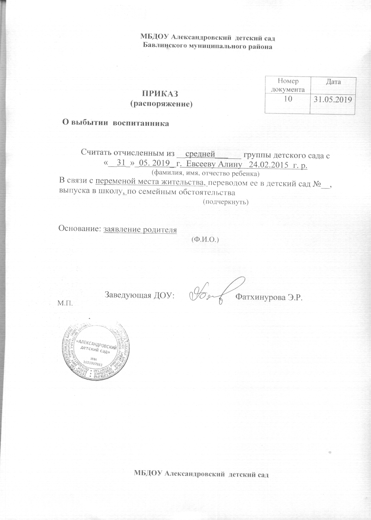 Приказ о выбытиииз средней разновозрастной группы 1 воспитанника № 10 от 31.05.2019г.bmp