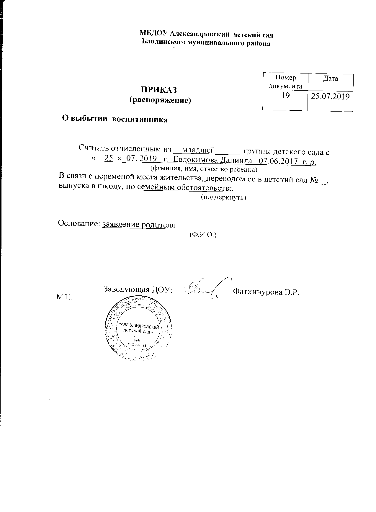 Приказ о выбытии из младшей разновозрастной группы 1 воспитанника № 19 от 25.07.2019г.bmp
