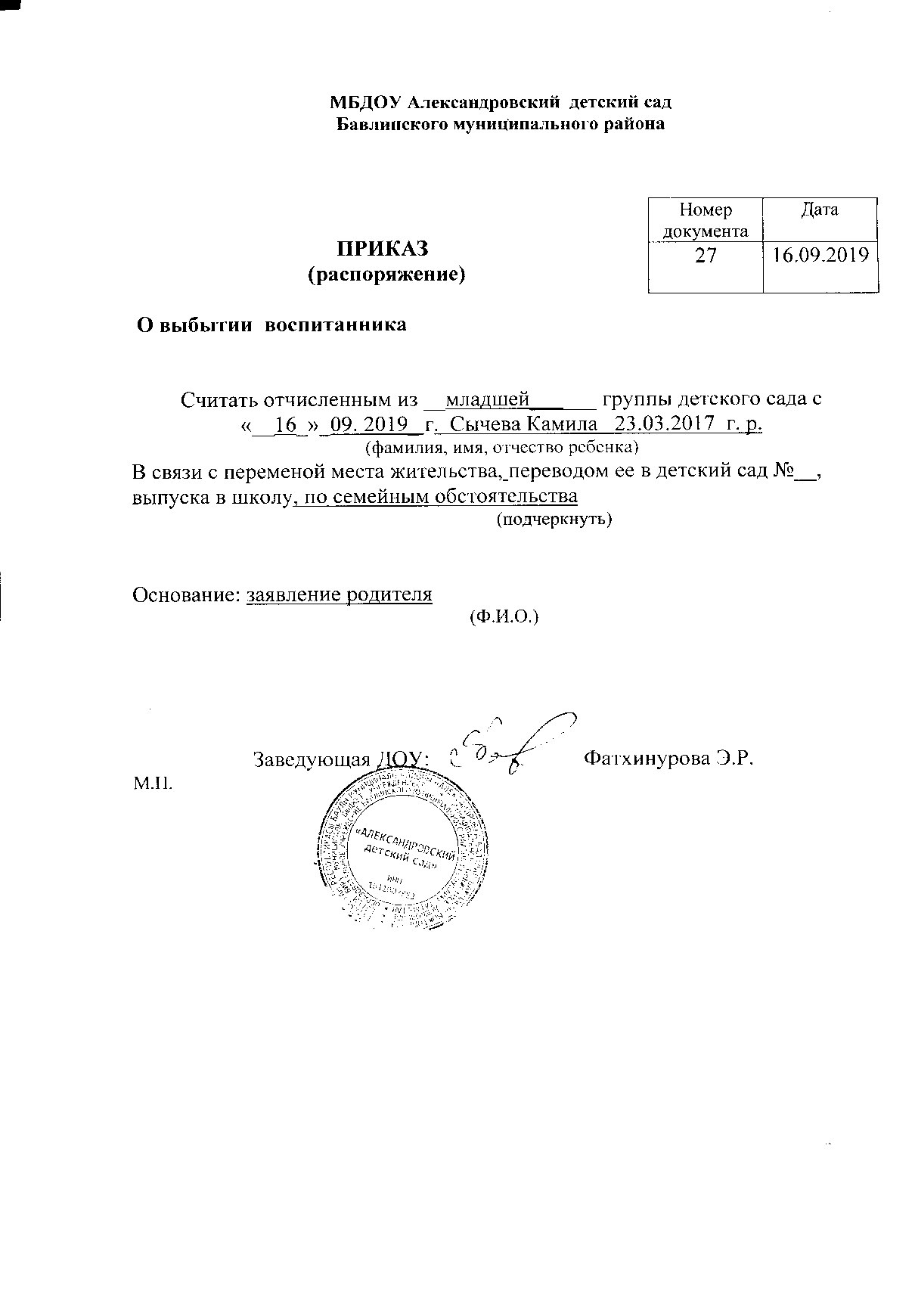 Приказ о выбытии из младшей разновозрастной группы № 27 от 16.09.2019г 1 воспитанника.bmp