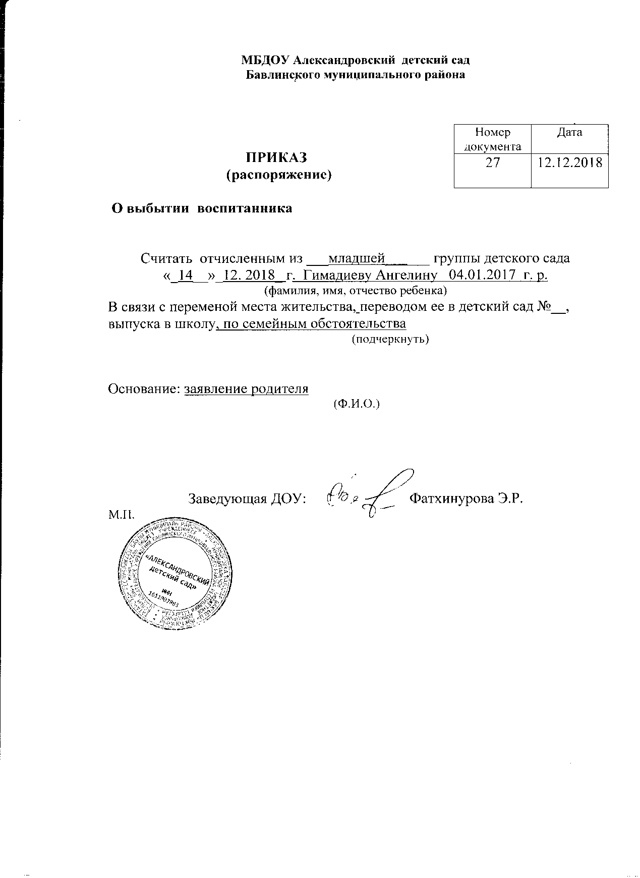 Приказ о выбытии из младшей разновозрастной группы 1 воспитанника № 27 от 12.12.2018г..bmp