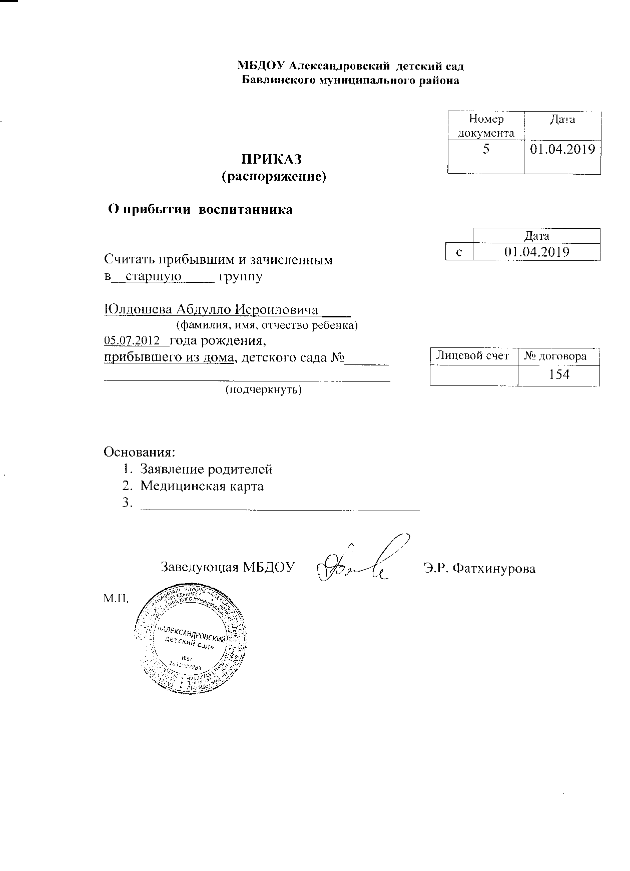 Приказ о прибытии в старшую разновозрастную группу 1 воспитанника № 5 от 01.04.2019г. bmp