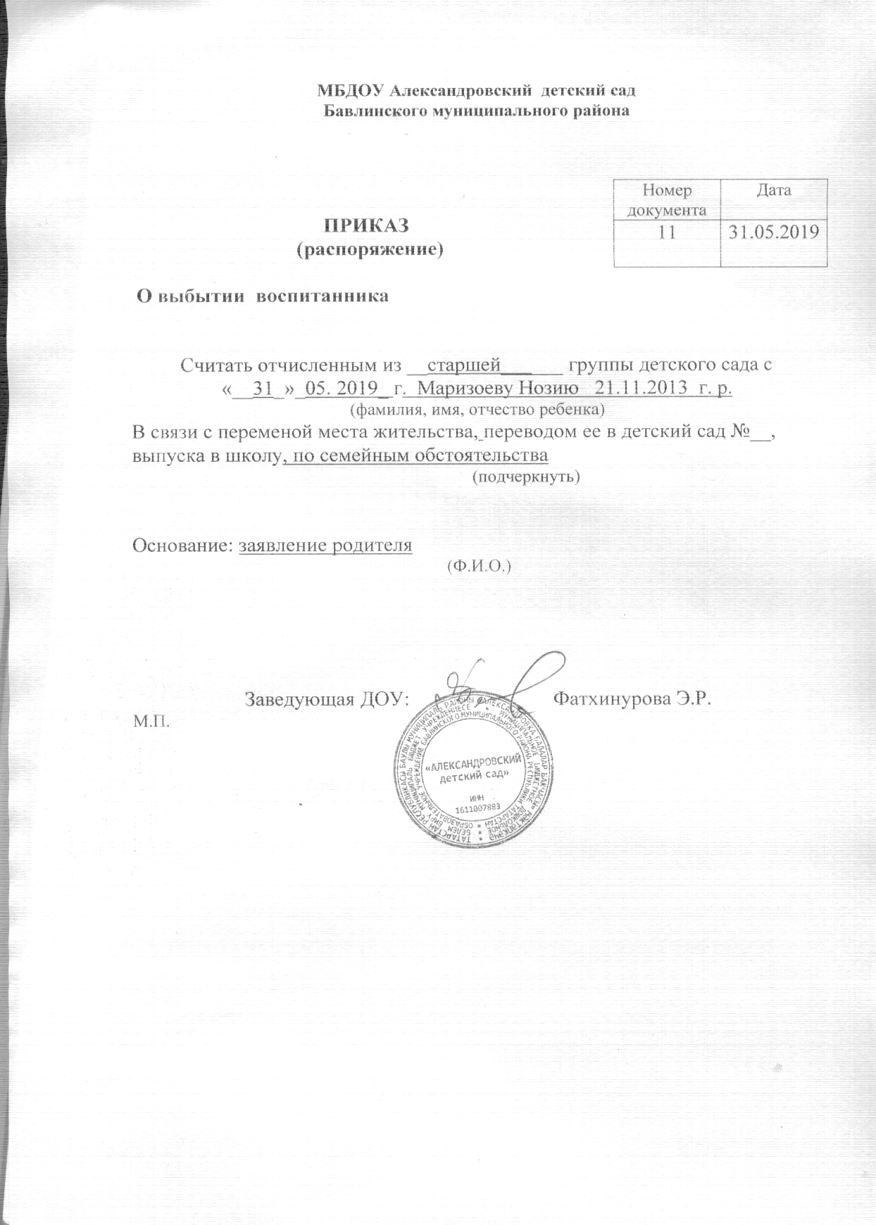 Приказ о выбытии из старшей разновозрастной группы 1воспитанника № 11 от 31.05.2019г.bmp