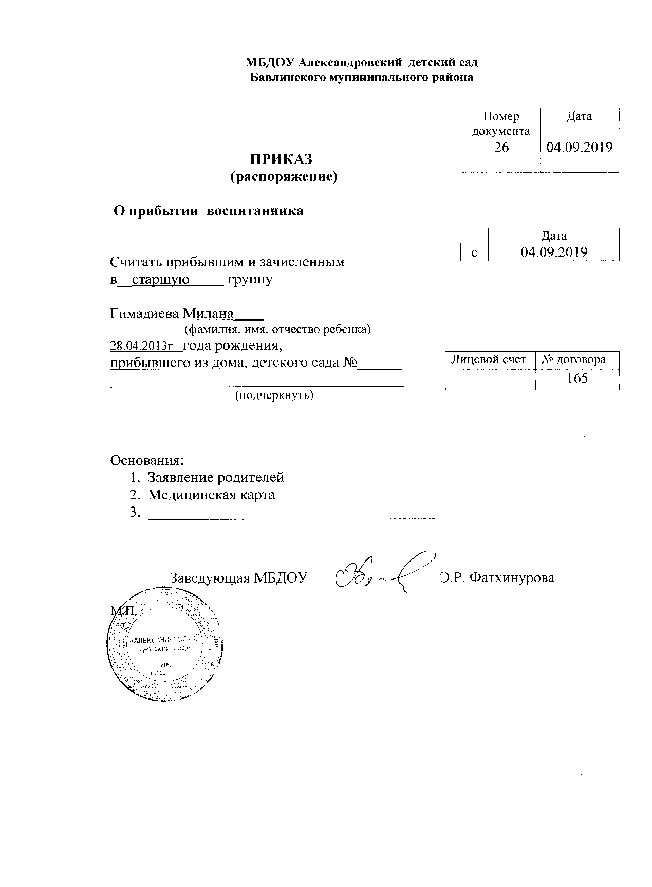 Приказ о прибытии в старшую разновозрастную группу № 26 от 04.09.2019г. 1 воспитанника.bmp
