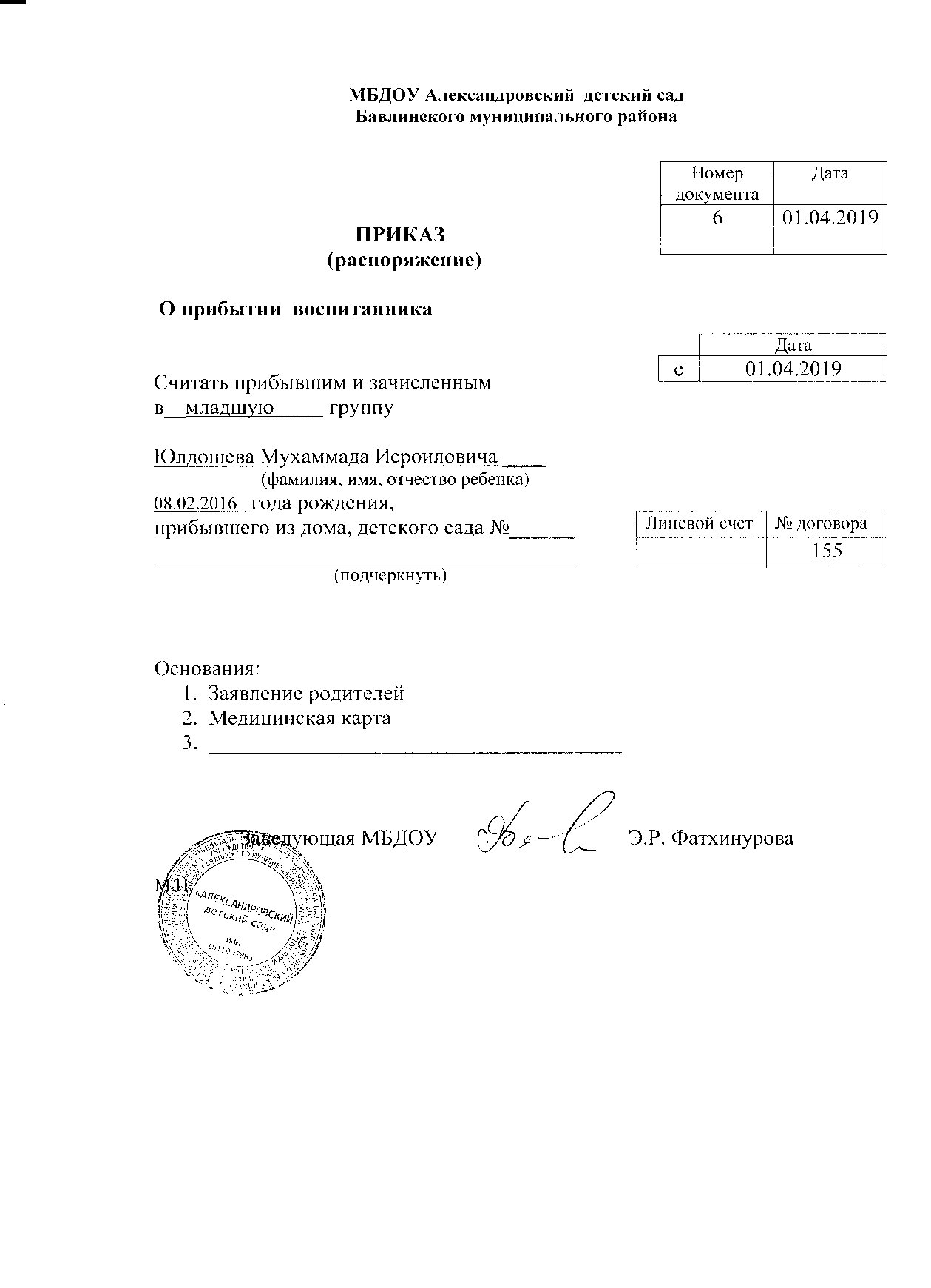 Приказ о прибытии в младшую разновозрастную группу 1 воспитанника № 6 от 01.04.2019г.bmp