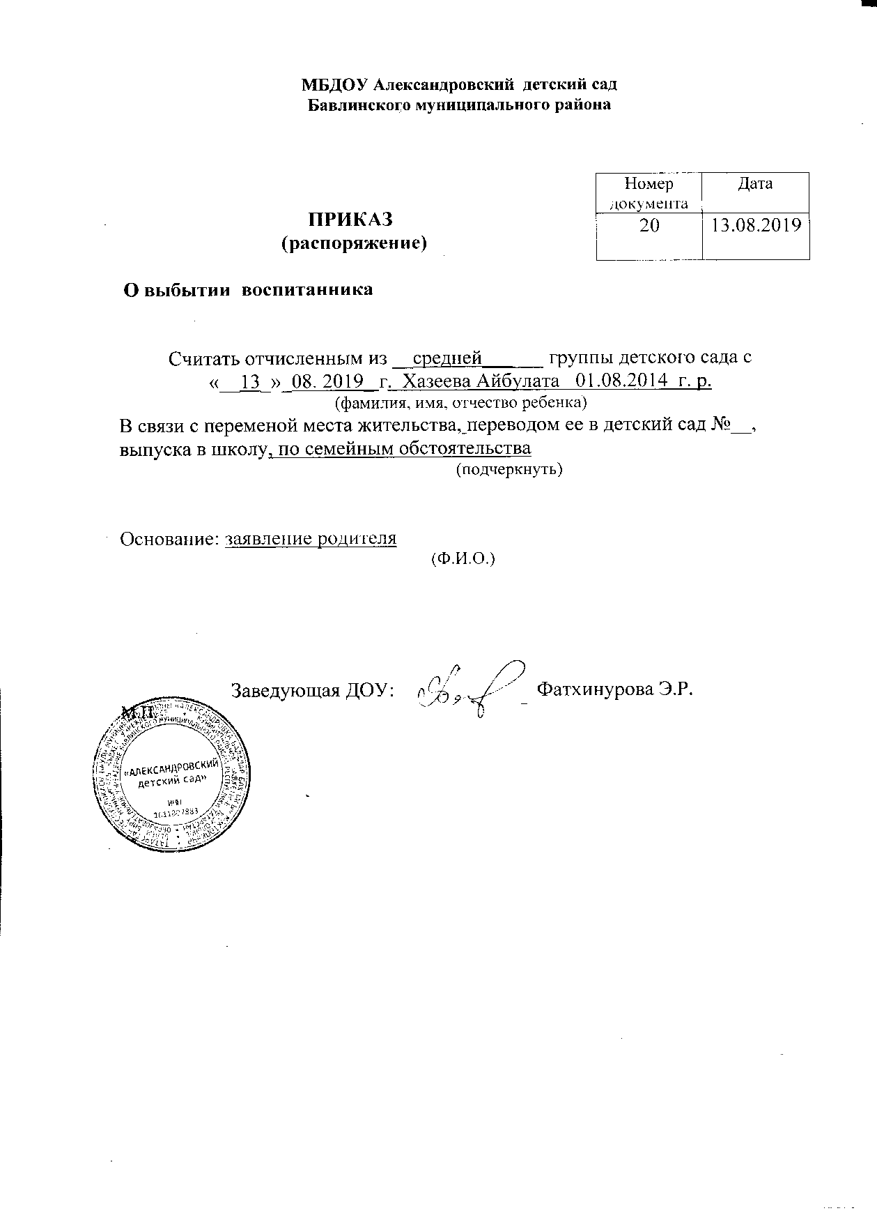 Приказ о выбытии из средней разновозрастной группы 1 воспитанника № 20 от 13.08.2019г.bmp