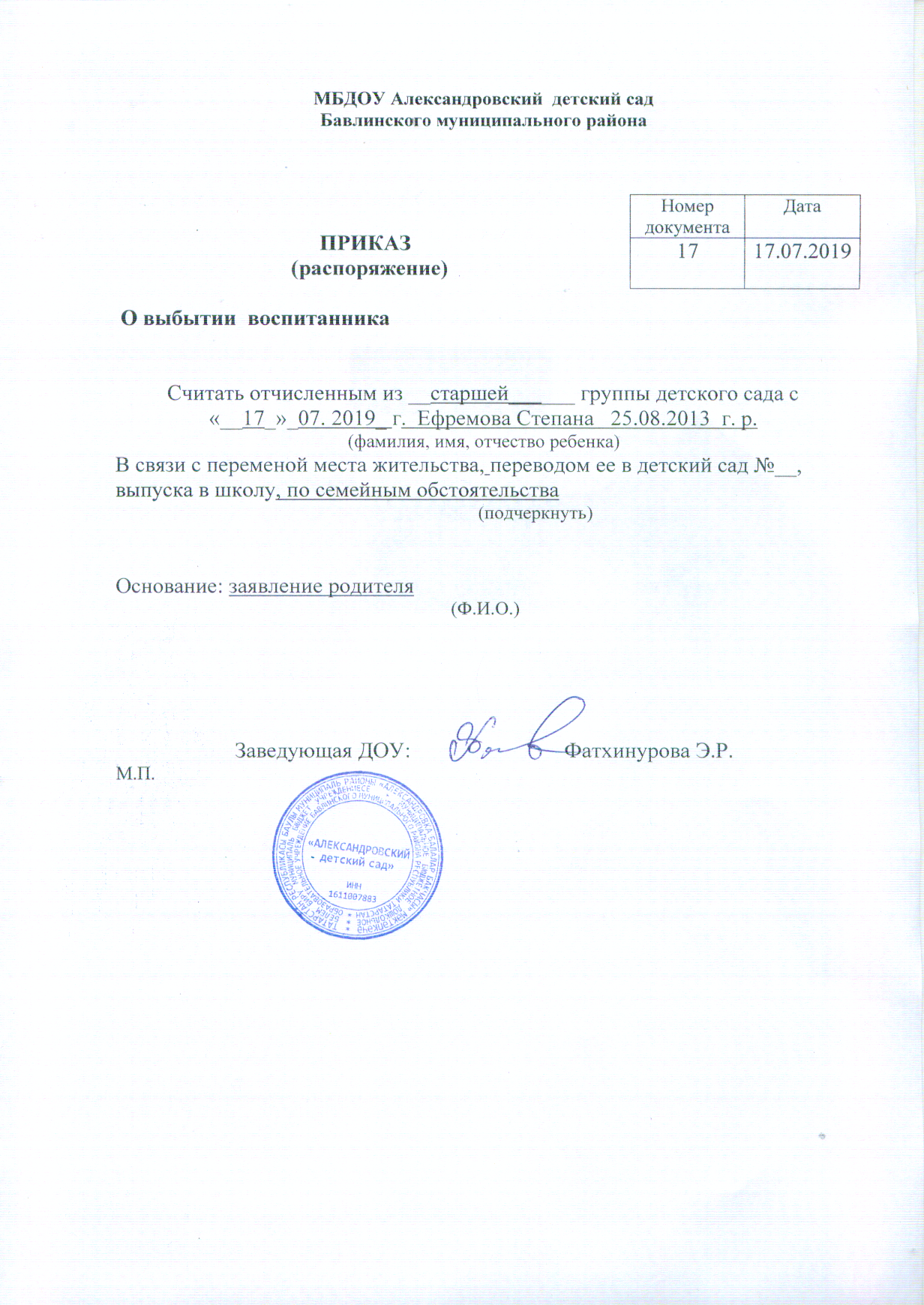 Приказ о выбытии из старшей разновозрастной группы 1воспитанника № 17 от 17.07.2019г..bmp