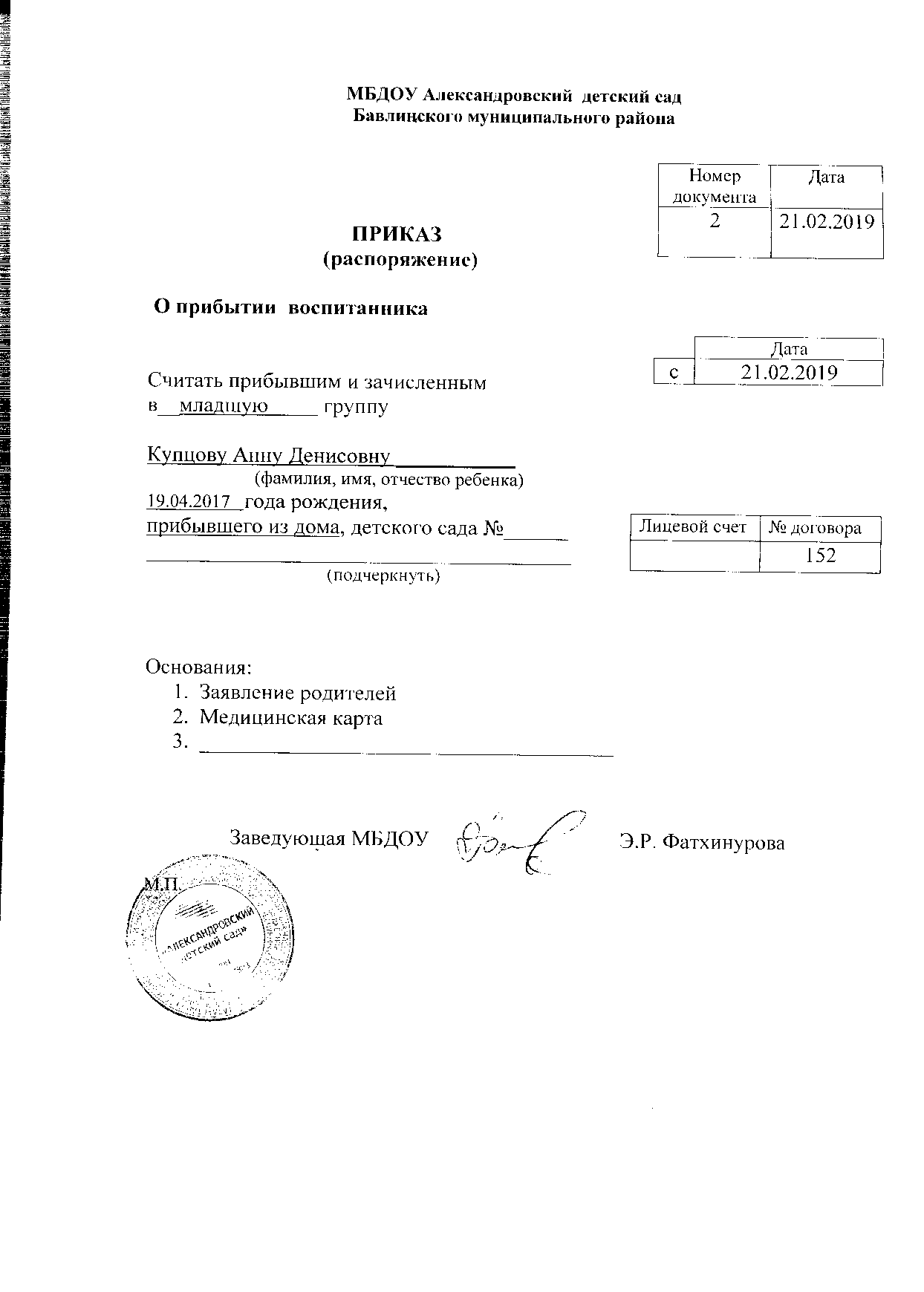 Приказ о прибытии в младшую разновозрастную группу 1 воспитанника № 2 от 21.02.2019г.bmp