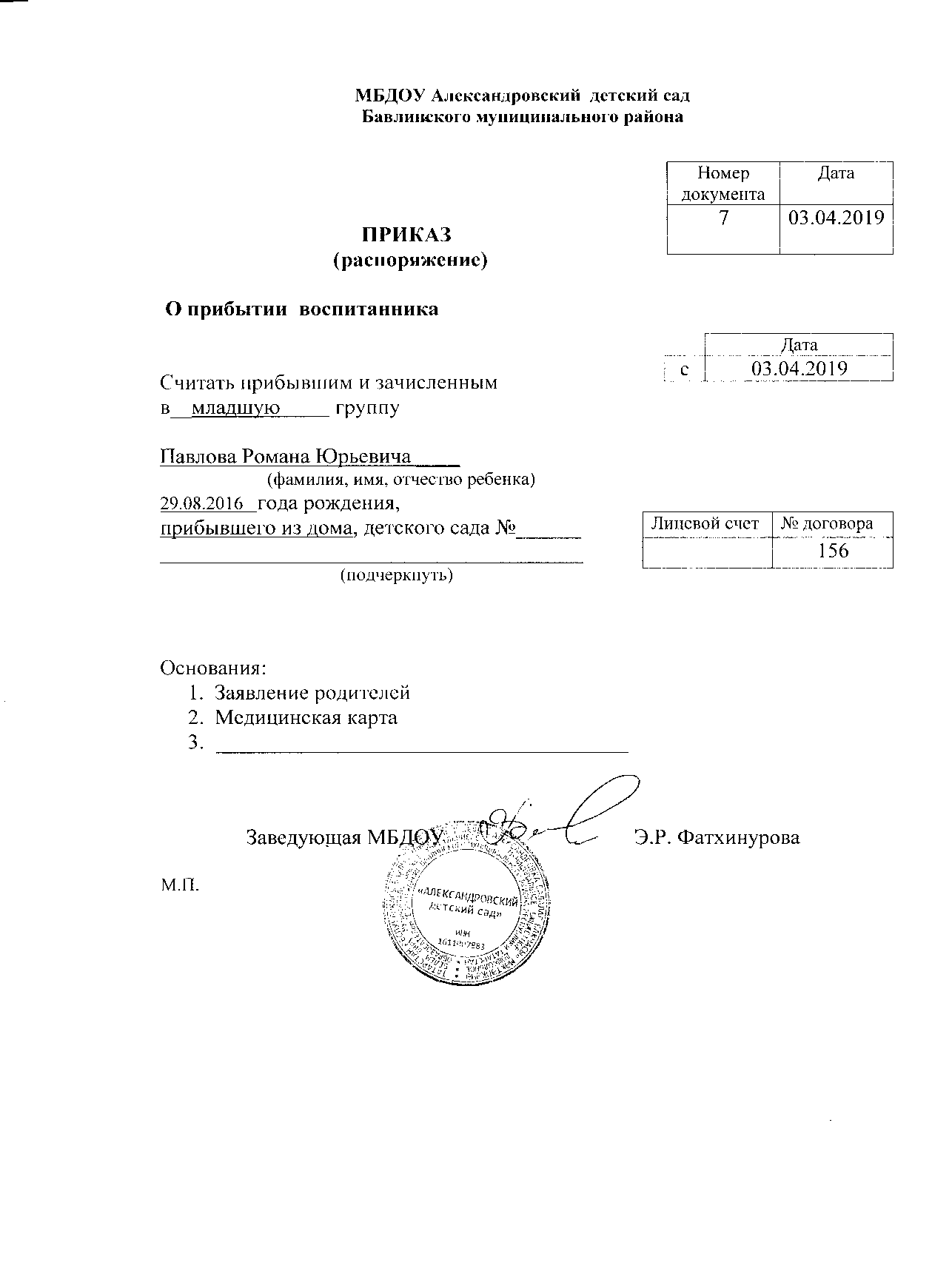 Приказ о прибытии в младшую разновозрастную группу 1 воспитанника № 7 от 03.04.2019г.bmp