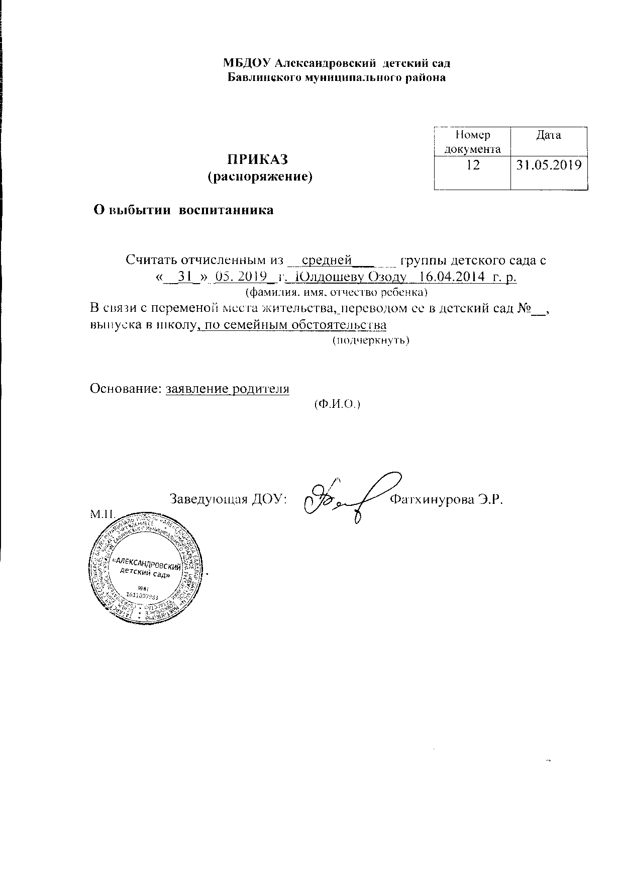 Приказ о выбытии из средней разновозрастной группы 1воспитанника № 12 от 31.05.2019г.bmp