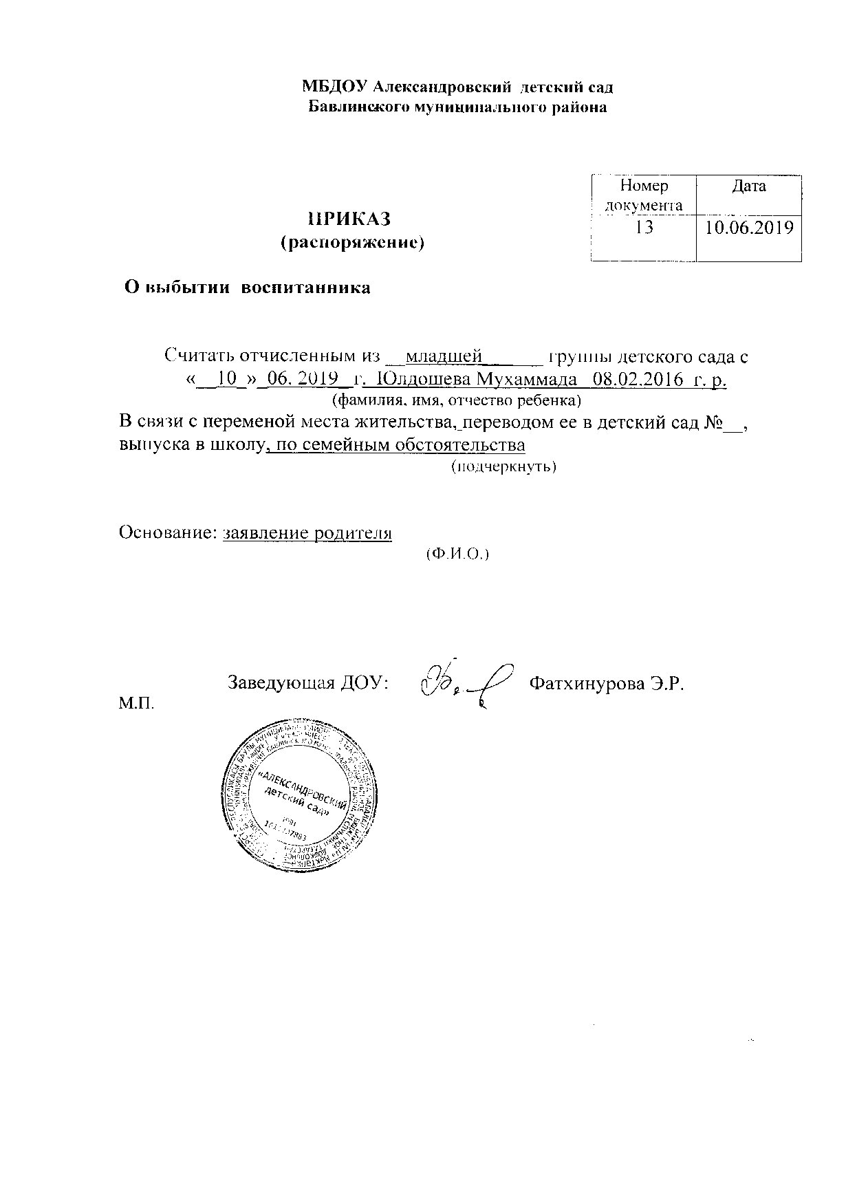 Приказ о выбытии из младшей разновозрастной группы 1воспитанника № 13 от 10.06.2019г.bmp