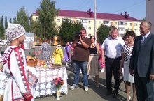 На фото выступающие представляют выставку, посвященную национальной культуре своего сельского поселения.