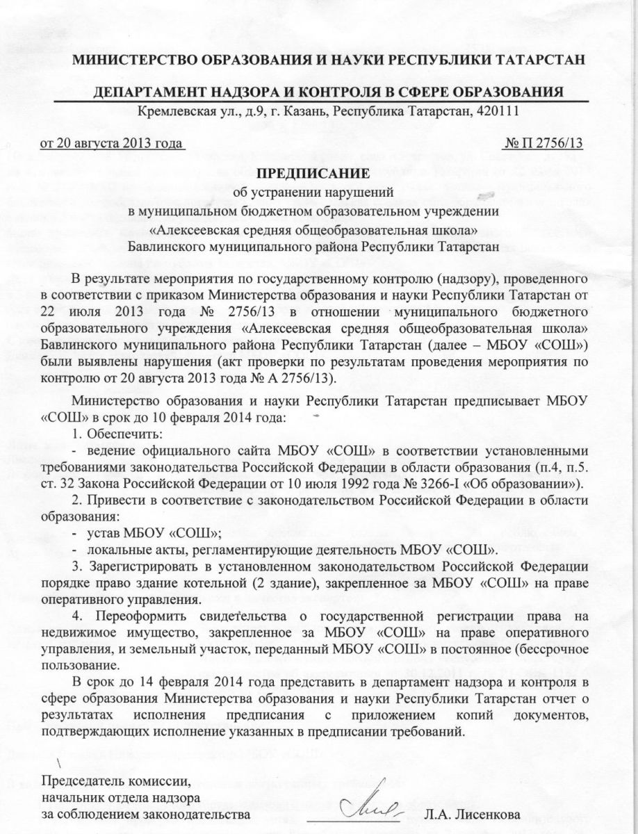 Предписание МО и Н РТ об устранении нарушений в МБОУ Алексеевская СОШ