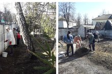 Сегодня, 21.04.2018 прошел очередной субботник на территории детского сада. Ограждения были окрашены побелкой, собрали всю траву.