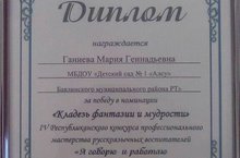 В педагогигическом колледже города Арск прошел IV республиканский конкурс профессионального мастерства русскоязычных воспитателей «Я говорю и работаю на татарском – 2017» в финалисты вышли 16 участников, среди которых воспитатель нашего детского сада Ганиева Мария Геннадьевна заняла 5 место! А так же, Мария Геннадьевна стала победителем номинации "Кладезь фантазии и мудрости"