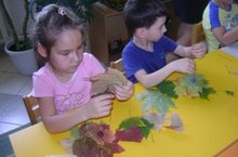 Дети подготовительной группы набрали много листьев на прогулке и решили сделать из них разноцветные гирлянды, добавив в них бусинки.