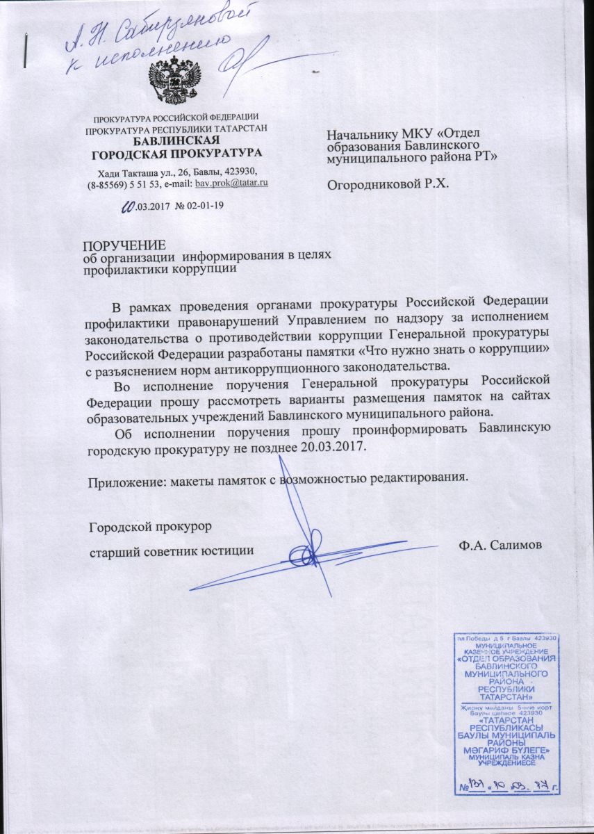 Поручение об организации информировании, в целях профилактики коррупции!
