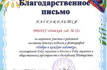 Благодарственное письмо за активное участие в районной выставке детских поделок и фотографий "Добро в каждую ладошку", посвященной Году экологии в России и Году экологии и общественных пространств в Республике Татарстан