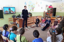 Недавно в нашем детском саду была организована встреча воспитанников подготовительной группы с инпектором ГИБДД. Он рассказал о том, как важно соблюдать правила дорожного движения и показал поучительный мультфильм.