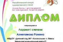 Подведены итоги Республиканского конкурса художественного чтения "Уголок России, с детства дорогой. Нет тебя красивей, Татарстан родной", посвящённый Дню Республики Татарстан. Поздравляем нашу юную воспитанницу Ахметзянову Рамину с дипломом Лауреата I степени! Желаем дальнейших успехов! 15.09.2023