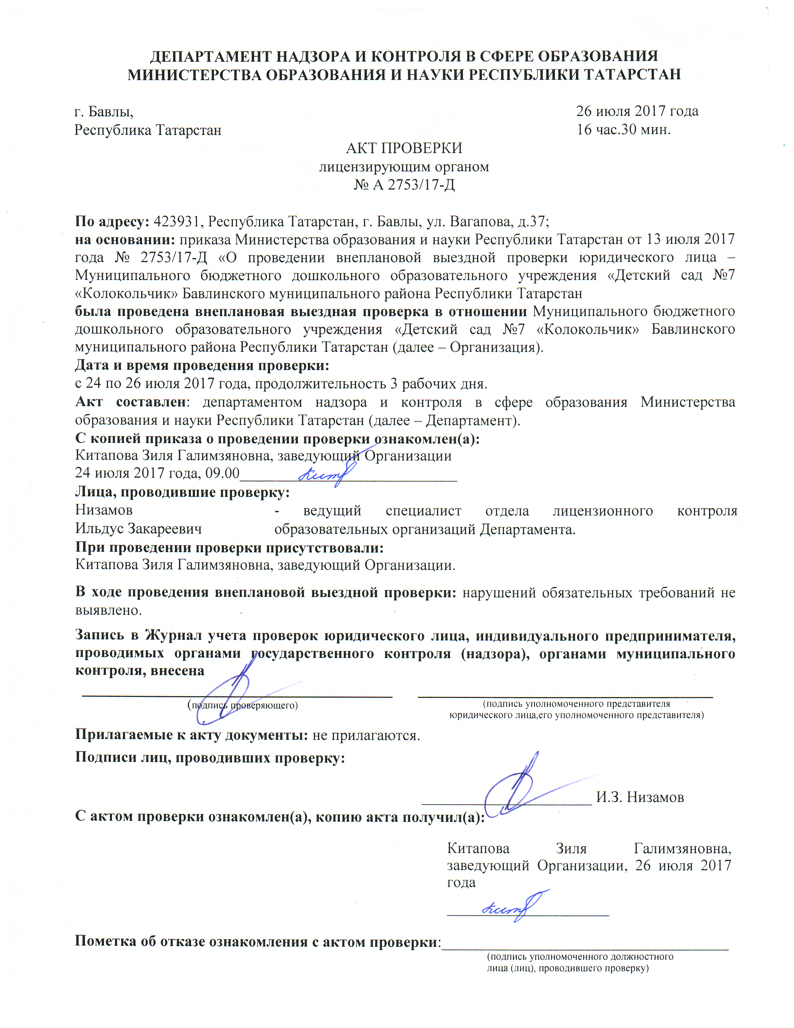 Акт проверки лицензирующим органом № А 2753/17-Д (Департамент надзора и контроля в сфере образования Министерства Образования и науки Республики Татарстан