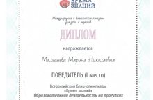 Педагог Малышева М.Н. стала Победителем 1 место во Всероссийской блиц-олимпиаде "Время знаний"