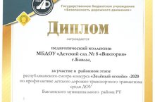 Наш Детский сад принял участие в районном этапе республиканского смотра-конкурса "Зеленый огонек"- 2020 по профилактике детского дорожно-транспортного травматизма среди ДОУ Бавлинского муниципального района РТ. Дипломом за участие.