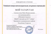 Воспитатель по обучению детей татарскому языку Сунгатуллина Райса Фахрисламовна стала Победителем 2 степени Регионального конкурса научно-исследовательских, методических и творческих работ "Мой Татарстан".