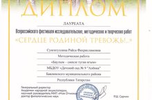 Воспитатель по обучению детей татарскому языку Сунгатуллина Райса Фахрисламовна стала лауреатом Всероссийского фестиваля исследовательских, методических и творческих работ "Сердце Родины Тревожь!.."