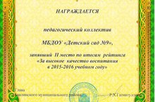 Поздравляем коллектив детского сада, занявшего 2 место по итогам рейтинга "За высокое качество воспитания в 2015-2016 учебном году"!