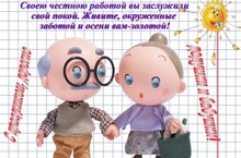 Столько оптимизма в молодых не будет,В этом мы пример возьмём сейчас!Танцы под гармошку и с душевной песнейБудет вам теплей и веселей!Чаем угощают вас друзья-подружки,Бодрость духа и в глазах светлей!Долгих лет желаем, а ещё здоровьяИ к врачам по-меньше приходить!Лучшее лекарство — песня за столами,И забота близких, Вас должны любить!Хөрмәтле өлкән яшьтәгеләр!Сезне коллективыбыз исеменнән бәйрәм белән тәбрик итәбез! Сезгә алдагы тормышыгызда сәламәтлек, җан тынычлыгы, балаларыгыздан изгелекләр генә күрүегезне телибез!