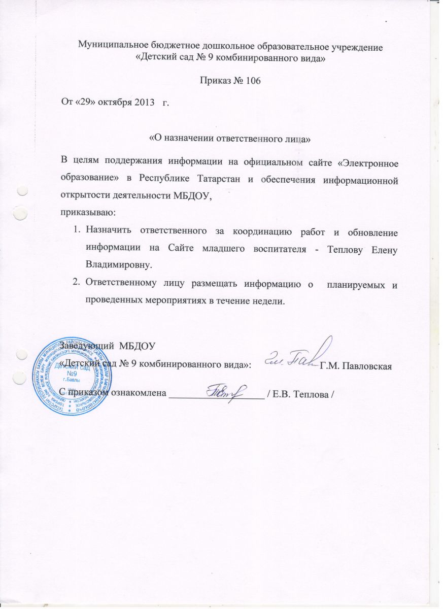 Приказ об ответственном по работе в информационной системе "Электронное образование"