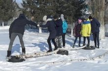 Сегодня в школе прошла игра "Зарница". Отряд "Адреналин" на этапе "Преодоление полосы препятствий" - переправа по бревну.