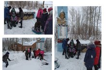 "Поделись добротой своей детской души!". Под этим девизом тимуровский отряд нашей школы расчитил от снега территорию стеллы. Ребята возложили венок и почтили память погибших в ВОВ минутой молчания.