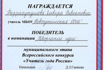 Она удостоена грамотой МКУ "Отдел образования БМР РТ" в номинации "ТВОРЧЕСКИЕ ИДЕИ"