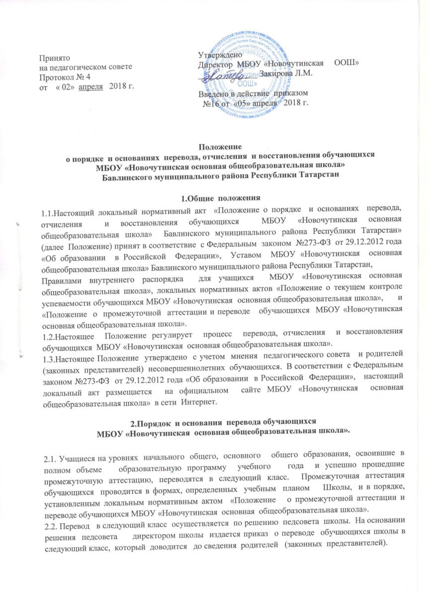 Положение о порядке и основании перевода, отчисления и восстановления обучающихся (скан)