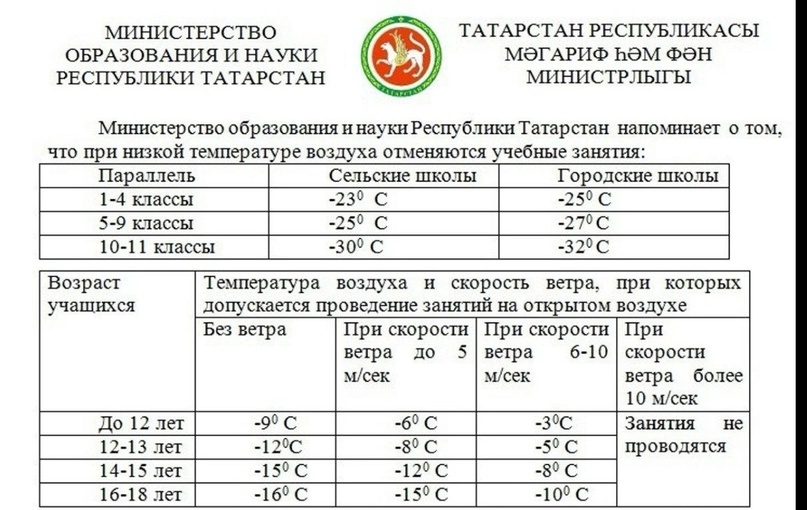 В связи с резким похолоданием и сильными морозами Минобрнауки РТ направило письма с рекомендациями о возможности отмены учебных занятий в связи с низкой температурой воздуха.