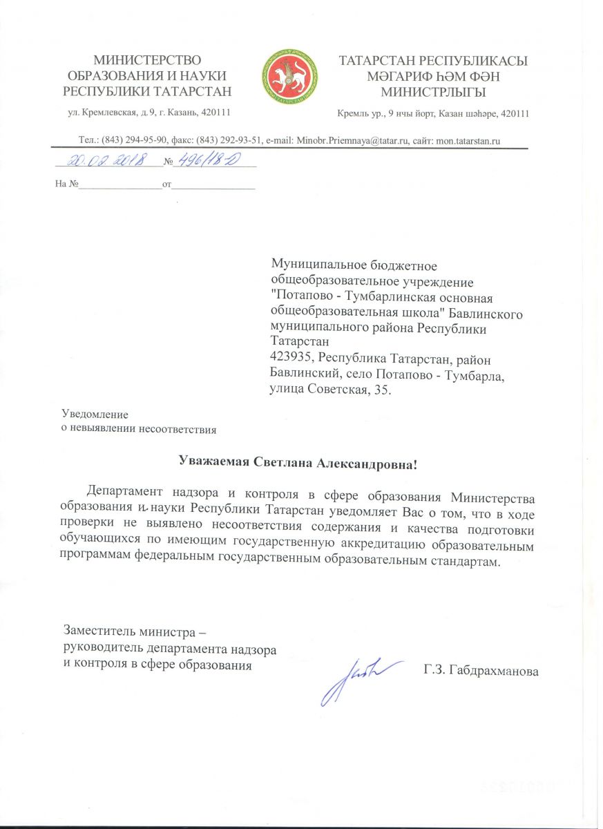 Уведомление Департамента надзора и контроля в сфере образования МО и Н РТ, 2018 год