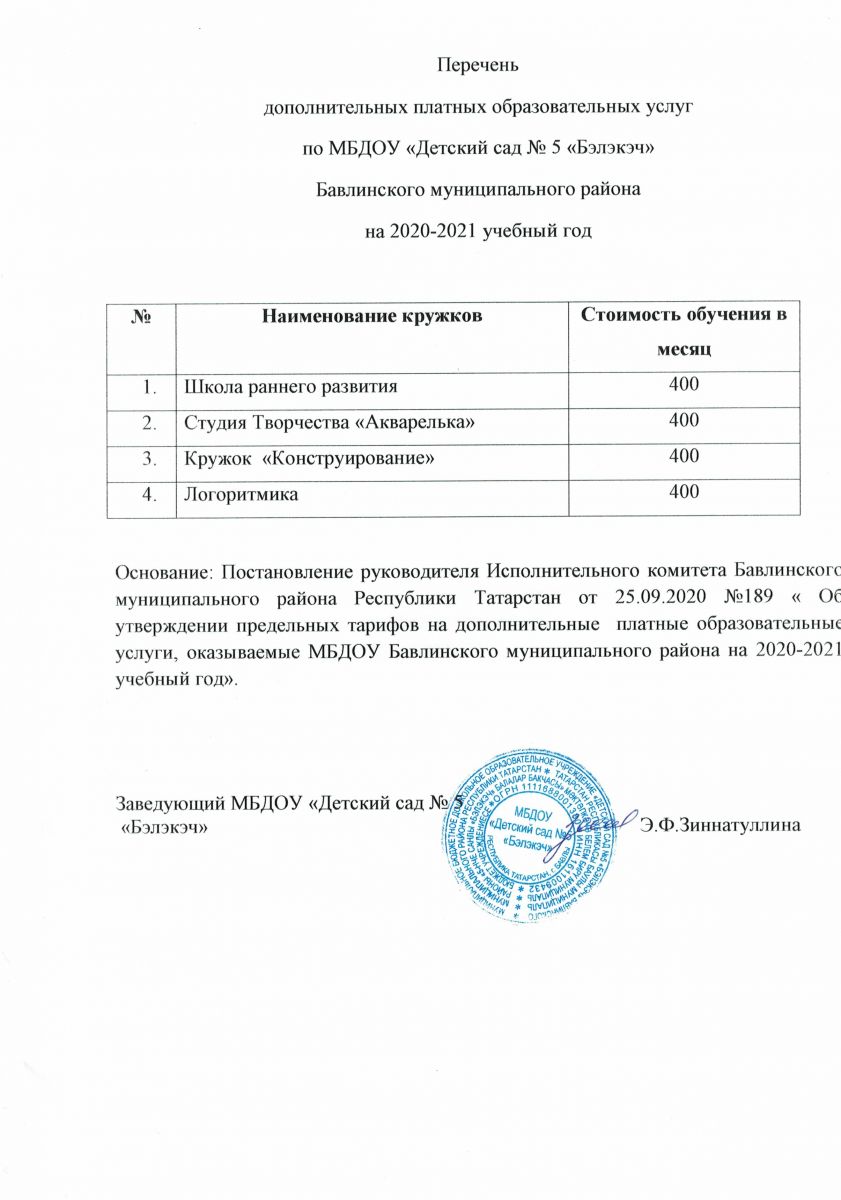 Перечень дополнительных платных образовательных услуг на 2020-2021 год