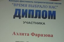 Учитель английского языка Фаразова Аэлита Серверовна приняла участие в конкурсе-фестивале патриотической песни "Время выбрало нас". По результатам отборочного тура Аэлита Серверовна прошла в финал, с чем мы её и поздравляем!