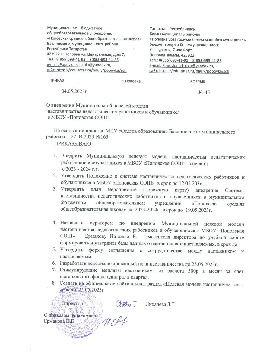Положение "О системе наставничества педагогических работников и обучающихся в МБОУ "Поповская СОШ"