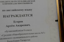 26 марта в Казани состоялась церемония награждения победителей и призеров республиканской олимпиады школьников «Путь к Олимпу» по английскому языку. Заключительный этап олимпиады прошел с 23 по 26 марта, в нем приняли участие около 200 человек. Шесть из них стали победителями, еще 38 – призерами.Победителем среди 8 классов стал обучающийся МБОУ «Средняя общеобразовательная школа №7» Егоров Артем Андреевич. Руководитель Демидова Надежда Петровна, учитель английского языка и литературы МБОУ «Средняя общеобразовательная школа №7»Итоги олимпиады подвел заместитель Премьер-министра Республики Татарстан – министр образования и науки Энгель Фаттахов на совещании с участием начальников управлений (отделов) образования муниципальных районов и их заместителей по учебно-методической работе.